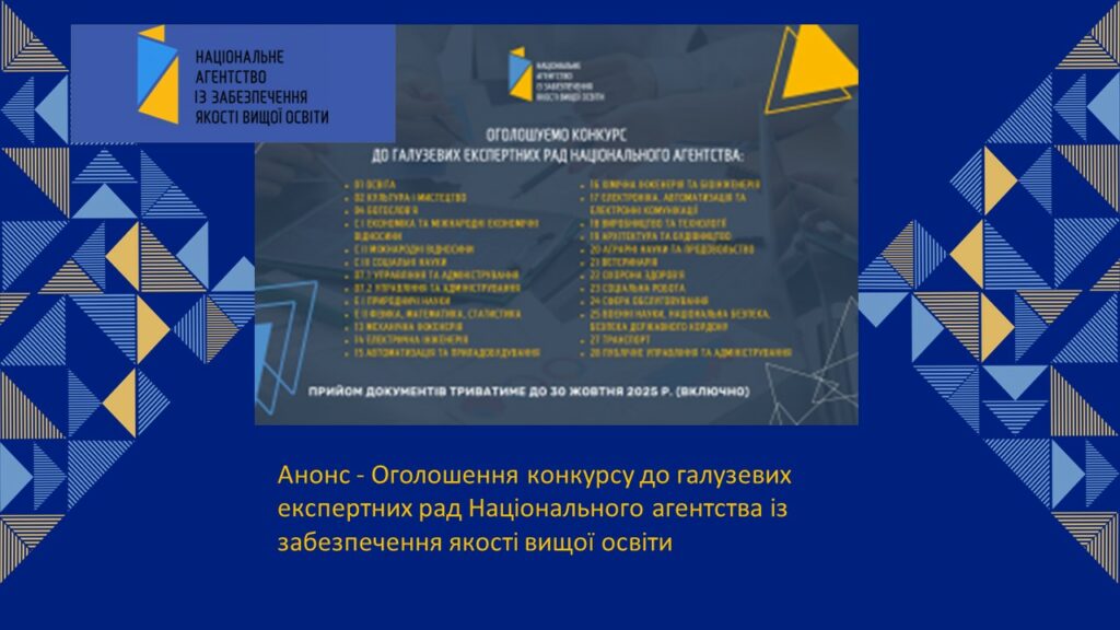 - Анонс – Оголошення конкурсу до галузевих експертних рад Національного агентства із забезпечення якості вищої освіти