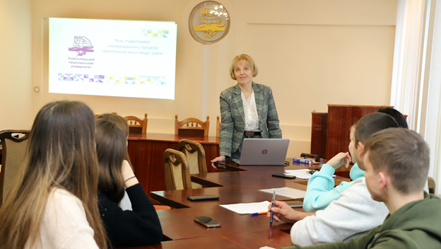 24 листопада 2023 року відбулася зустріч членів Студенської ради університету з співробітниками Відділу забезпечення якості вищої освіти, під час якої було проведено заняття на тему «Роль студентського самоврядування в системі забезпечення якості вищої освіти». Красильникова Г.В. та Білик В.В. ознайомили членів ради з системою внутрішнього забезпечення якості в університеті, наголосили на ролі органів студентського самоврядування у процедурах забезпечення якості освітньої діяльності та якості вищої освіти, розповіли про анкетування для як форму отримання зворотної інформації від учасників освітнього процесу про його стан та якість.