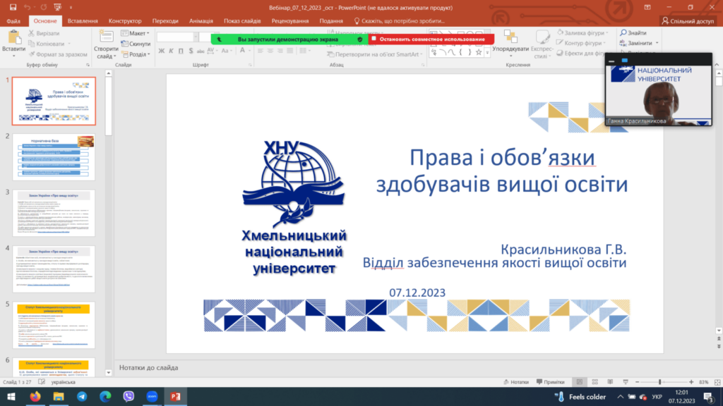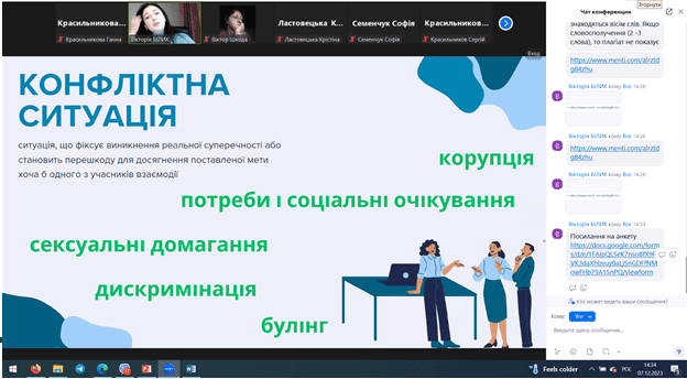 7 грудня 2023 року відбулися збори учасників фокус-груп здобувачів вищої освіти із забезпечення якості освітньої діяльності та якості вищої освіти в університеті. Здобувачі вищої освіти бакалаврського, магістерського та освітньо-наукового рівнів усіх 8 факультетів взяли участь у вебінарі «Права і обов’язки здобувачів вищої освіти», який провела завідувач відділу забезпечення якості вищої освіти професор Ганна Красильникова. Разом з провідним фахівцем відділу Вікторією Білик учасники зборів розглянули низку можливих конфліктних ситуацій в освітньому середовищі та шляхи їх вирішення.