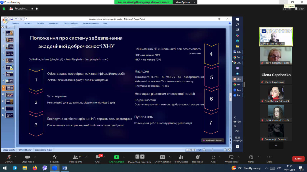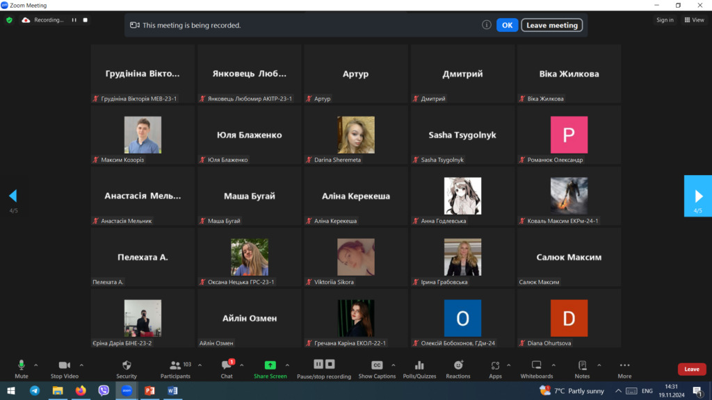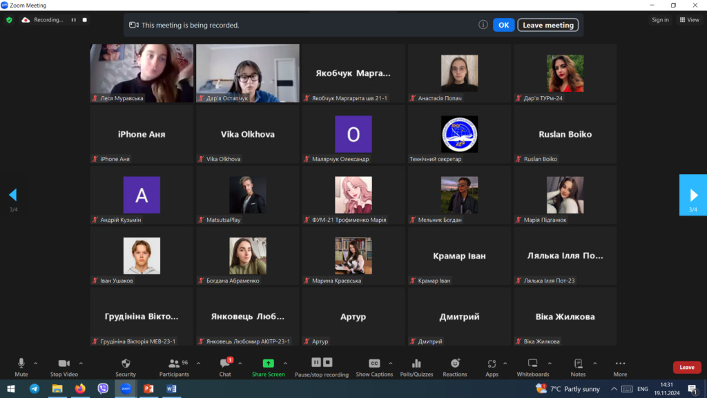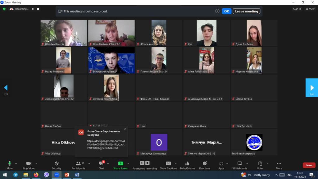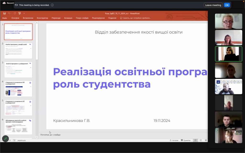 19 листопада 2024 року відбулися збори учасників фокус-груп здобувачів вищої освіти із забезпечення якості освітньої діяльності та якості вищої освіти в університеті, які провели співробітники відділу забезпечення якості вищої освіти Ганна КРАСИЛЬНИКОВА, Олена ГАПЧЕНКО, Ірина КВАСНИЦЯ та Володимир МИЛЬКО. Понад сто шістдесят учасників, здобувачів вищої освіти бакалаврського, магістерського та освітньо-наукового рівнів усіх факультетів, взяли участь в онлайн зустрічі.