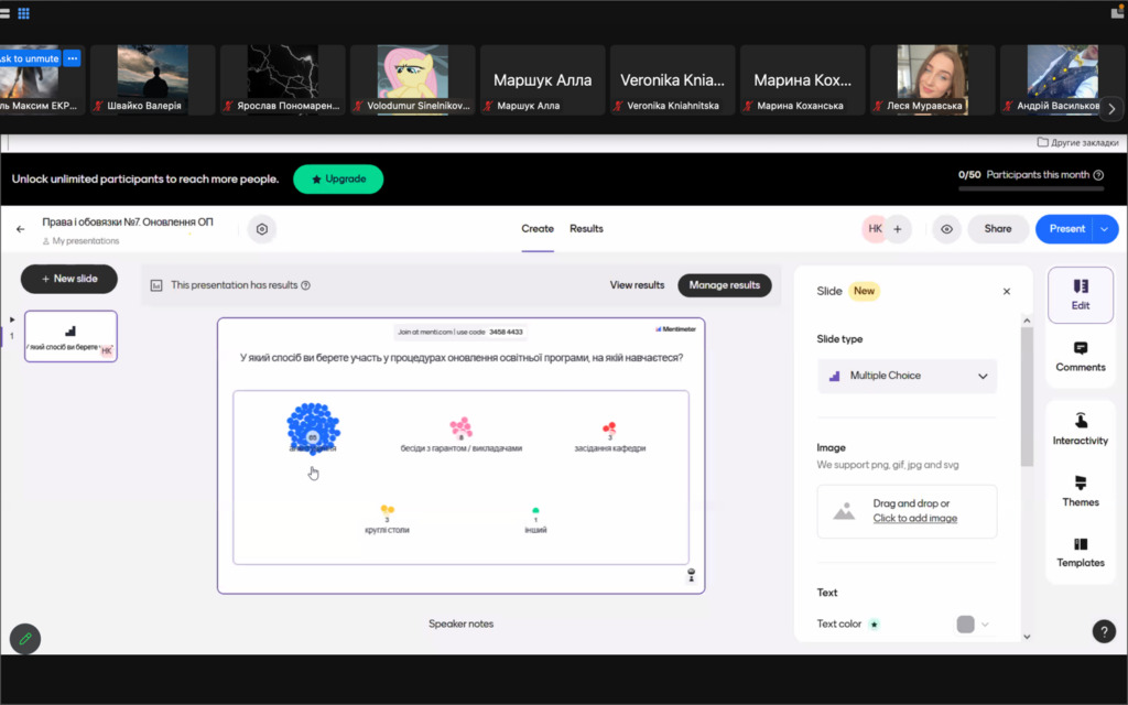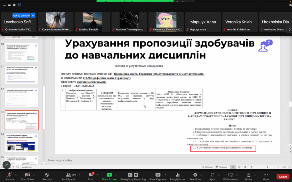 Учасники зібрання взяли участь в інтерактивному опитуванні щодо можливих способів їх долучення до процедур оновлення освітніх програм.