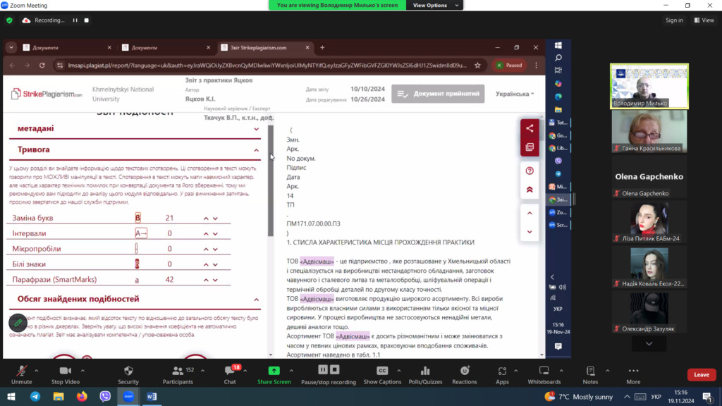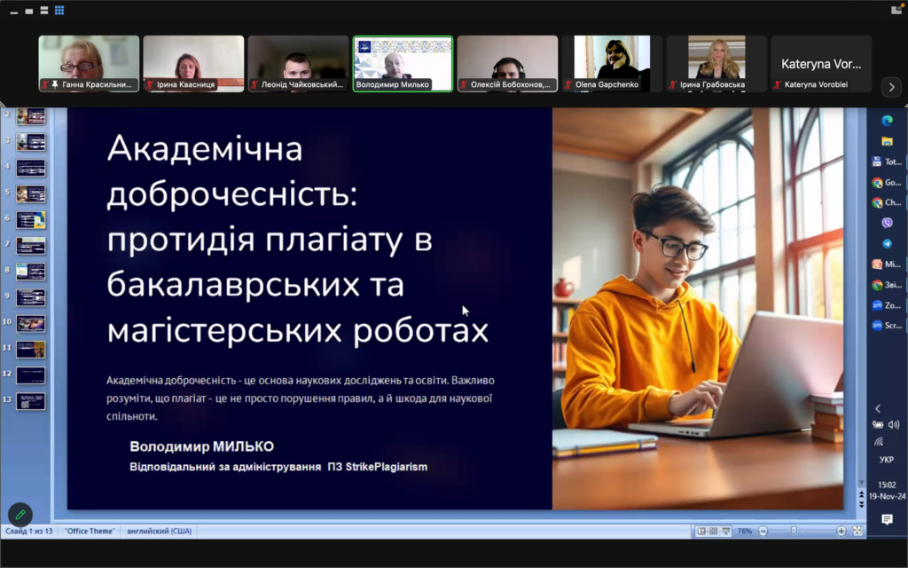 Відповідальний за адміністрування програмно-обчислювального комплексу StrikePlagiarism Володимир МИЛЬКО у виступі «Академічна доброчесність: протидія плагіату в бакалаврських та магістерських роботах» зосередив увагу на протидії академічного плагіату в студентських роботах. Володимир Володимирович докладно розповів про характерні особливості перевірки академічних текстів на унікальність програмно-обчислювальним комплексом StrikePlagiarism.