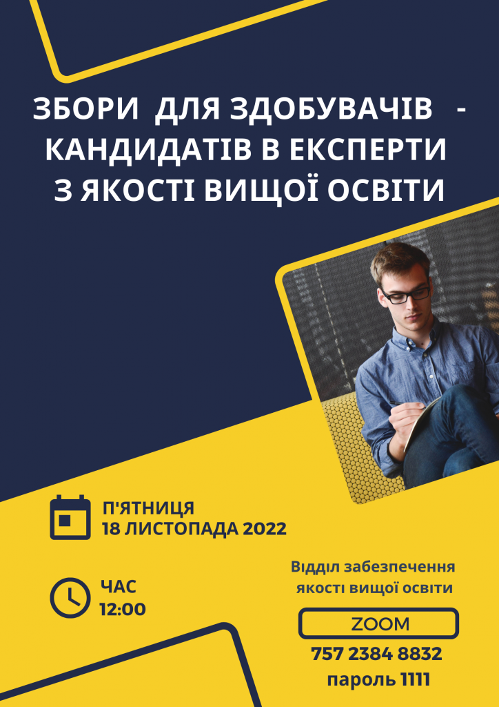 Повідомляємо вам, що триває донабір експертів до Національного агентства із забезпечення якості вищої освіти з числа здобувачів вищої освіти. Запрошуємо вас на збори для кандидатів з числа здобувачів вищої освіти. Збори відбудуться у онлайн-форматі на платформі ZOOM 18 листопада 2022 року о 12 00 год.