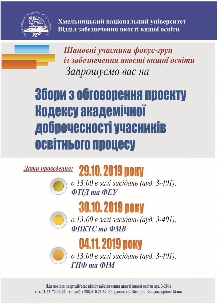 Впродовж жовтня-листопада 2019 року відділом забезпечення якості вищої освіти (завідувач Красильникова Г. В., провідний фахівець Білик В.В., фахівець Гапченко О.В.) проведено збори для учасників студентських фокус-груп із забезпечення якості вищої освіти щодо обговорення проекту Кодексу академічної доброчесності.