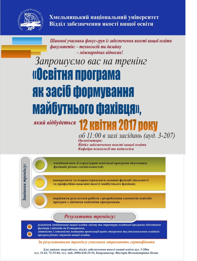 що 12 квітня 2017 року відбудеться тренінг з учасниками студентських фокус-груп із забезпечення якості освітньої діяльності та вищої освіти
