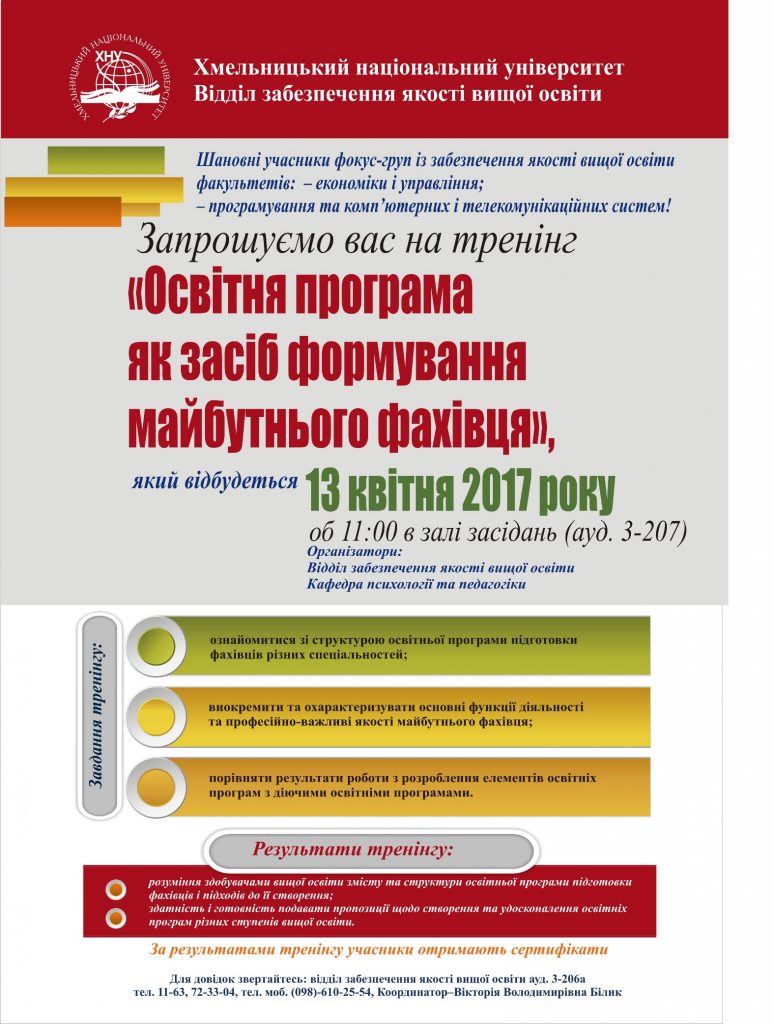 що 13 квітня 2017 року відбудеться тренінг з учасниками студентських фокус-груп із забезпечення якості освітньої діяльності та вищої освіти