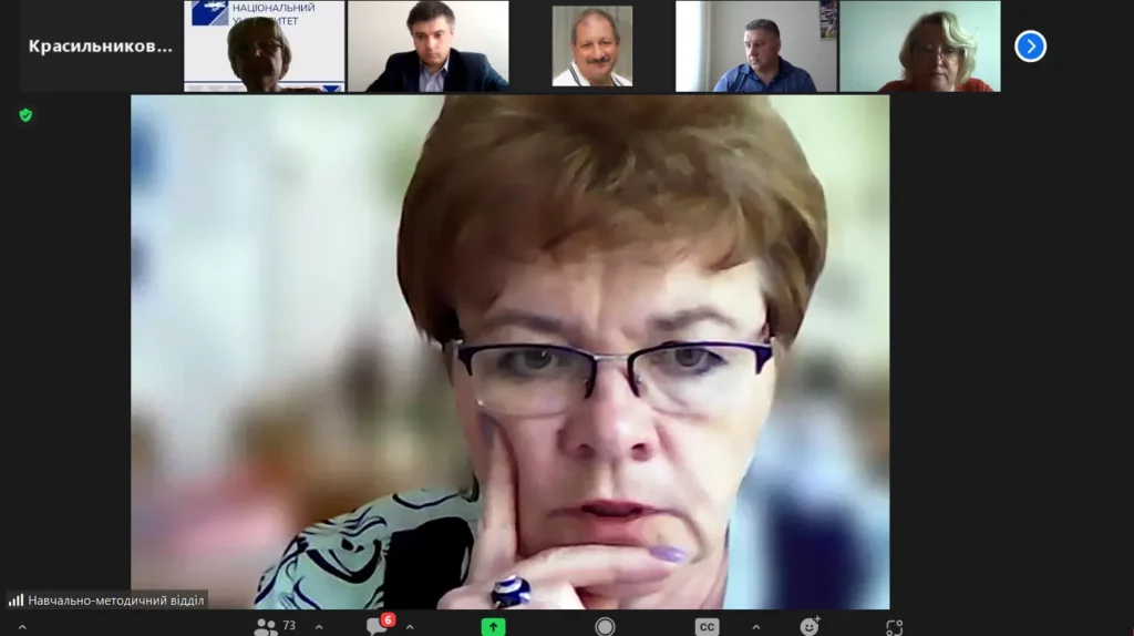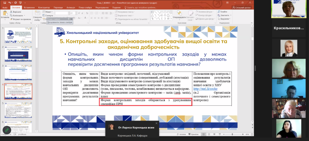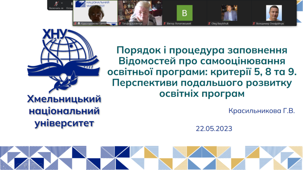 22 травня 2023 року відбулося чергове заняття для гарантів освітніх програм на тему «Порядок і процедура заповнення Відомостей про самооцінювання освітньої програми: критерії 5, 8 та 9. Перспективи подальшого розвитку ОП», яке провела завідувачка відділу забезпечення якості вищої освіти Хмельницького національного університету професорка Ганна КРАСИЛЬНИКОВА.