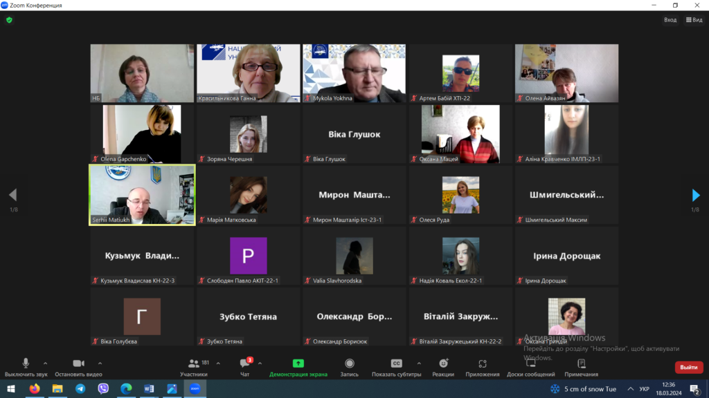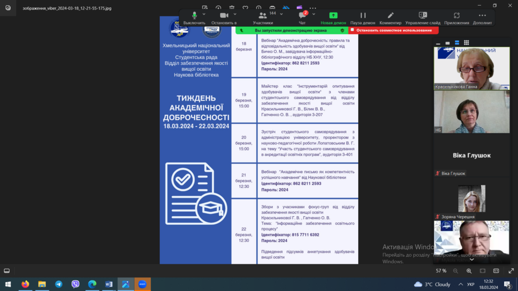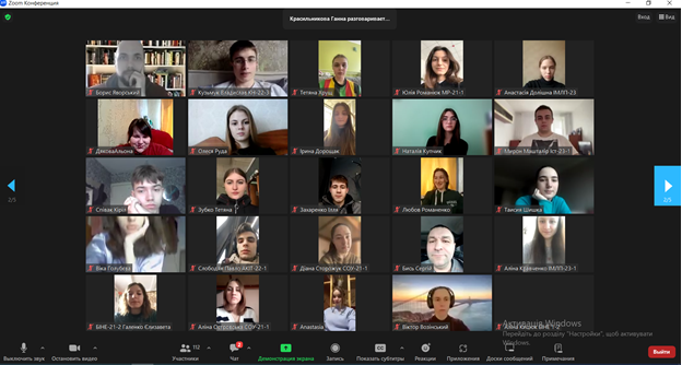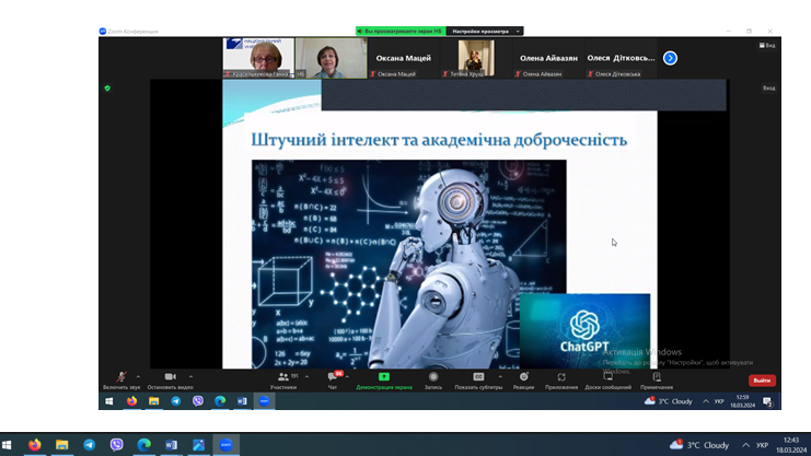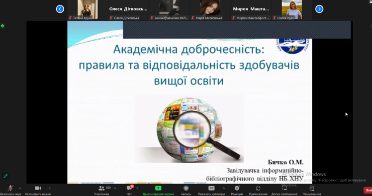 Завідувачка інформаційно-бібліографічного відділу Наукової бібліотеки Оксана Миколаївна Бичко розповіла учасникам вебінару – студентам молодших курсів про правила академічної доброчесності в освітньому процесі та відповідальність за їх порушення, торкнулася актуального питання використання штучного інтелекту в навчанні та ін. Понад 200 учасників вебінару з цікавістю прослухали актуальну інформацію.