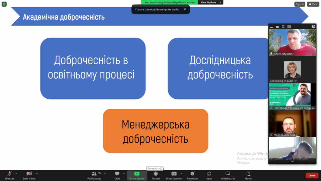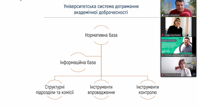 3 квітня 2024 року співробітники відділу забезпечення якості вищої освіти ХНУ взяли участь у благодійному онлайн-семінарі «Університетська система забезпечення академічної доброчесності: об’єднуємо цінності та алгоритми», організованого відділом моніторингу та забезпечення якості освіти Полтавського державного аграрного університету.