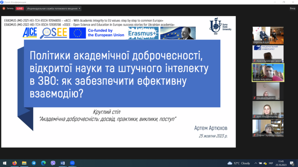 - «Політики академічної доброчесності, відкритої науки та штучного інтелекту в ЗВО: як забезпечити ефективну взаємодію?», Артем Артюхов, член Національного агентства із забезпечення якості вищої освіти, керівник Групи сприяння академічній доброчесності Сумського державного університету