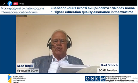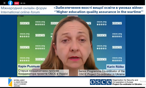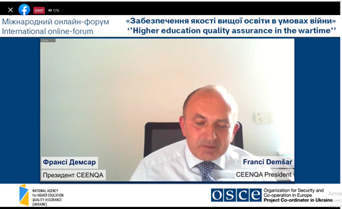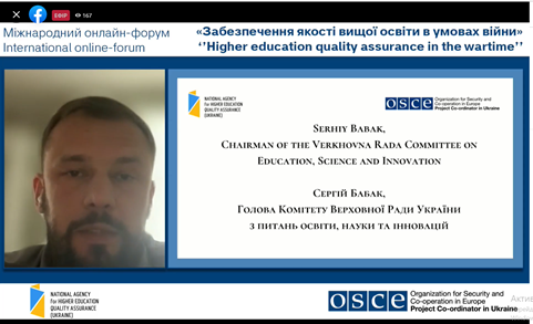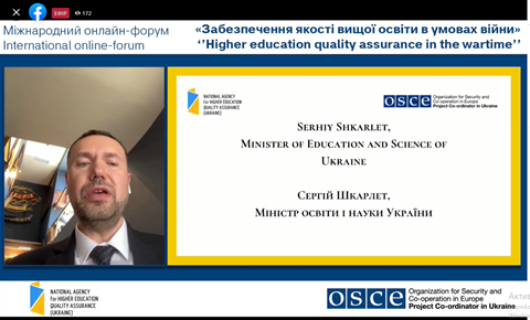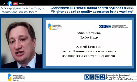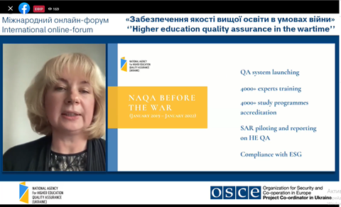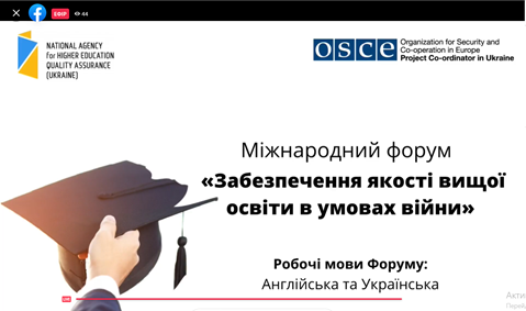 24 травня 2022 року співробітники відділу забезпечення якості вищої освіти взяли участь у міжнародному онлайн-форумі «Забезпечення якості вищої освіти в умовах війни», організований Національним агентством із забезпечення якості вищої освіти за підтримки Координатора проєктів ОБСЄ в Україні в межах проєкту «Сприяння підходам, заснованим на верховенстві права та правах людини, в системі вищої освіти» та у співпраці з Комітетом ВР з питань освіти, науки та інновацій, Міністерством освіти і науки України.