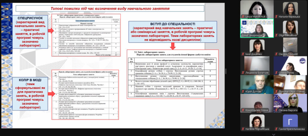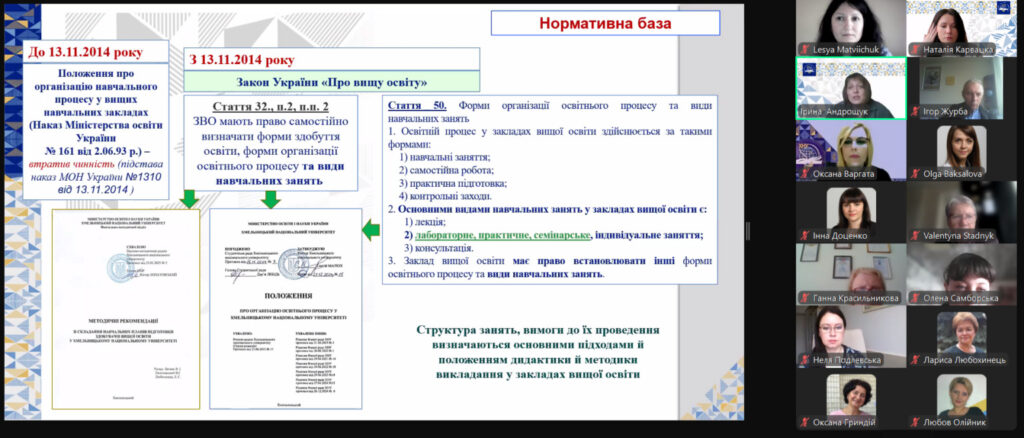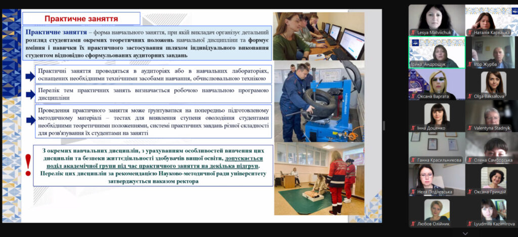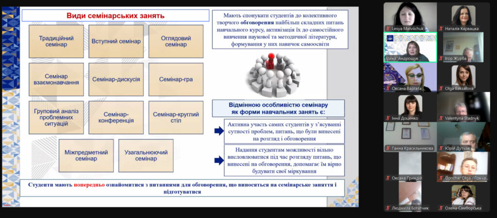 У фокусі обговорення були: особливості проведення, методичні засади підготовки до занять різних видів; спільні ознаки та відмінності практичних, лабораторних та семінарських занять; помилки під час визначення виду навчального заняття та ін. Спікер надала практичні рекомендації та відповіла на запитання учасників.