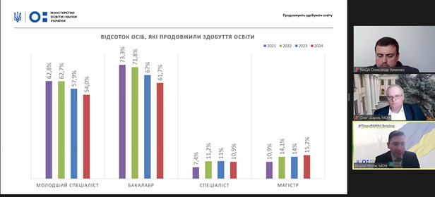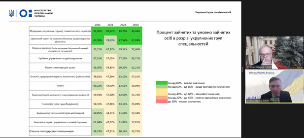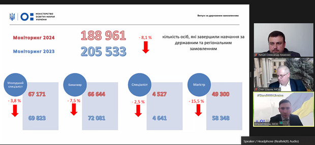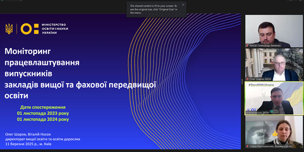 12 березня 2025 року відбулася онлайн нарада Міністерства освіти і науки України з питань моніторингу працевлаштування випускників закладів вищої та фахової передвищої освіти, у якій взяли участь заступник міністра МОНУ Михайло ВІННИЦЬКИЙ, члени директорату вищої освіти та освіти дорослих Олег ШАРОВ, Віталій НОСОК, керівник секретаріату Національного агентства із забезпечення якості вищої освіти Олександр ХИМЕНКО, голова Державного агентства України з питань мистецтва та мистецької освіти Ольга РОССОШАНСЬКА та ін. У нараді взяли участь понад 1000 представників закладів вищої та фахової передвищої освіти України.