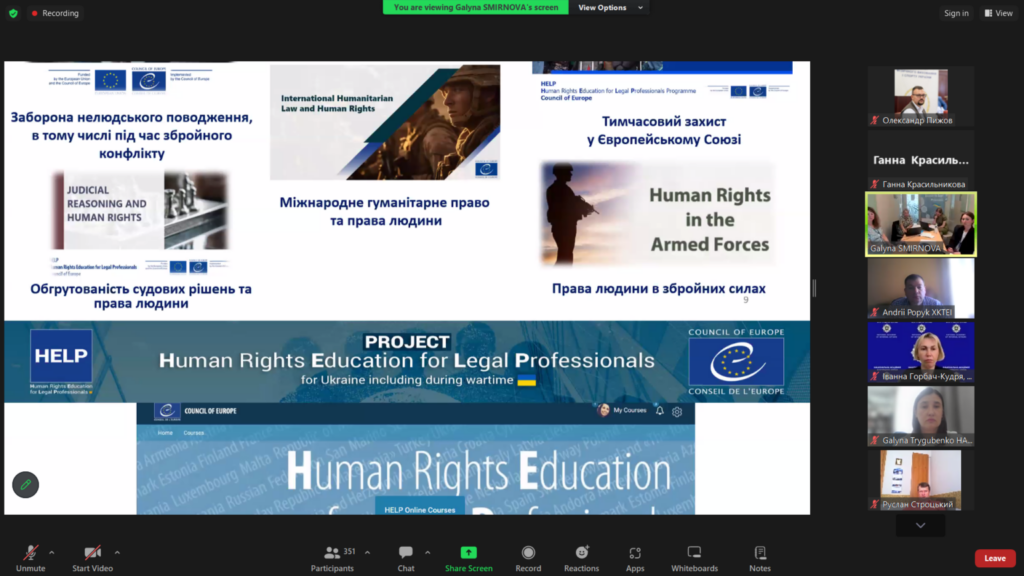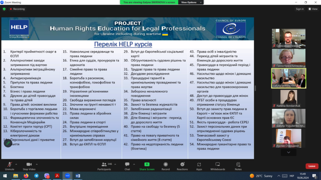 18 червня 2024 року співробітники відділу взяли участь у презентації Стратегії впровадження курсів Ради Європи «HELP (Освіта в галузі прав людини для юристів) для України, у тому числі під час війни».