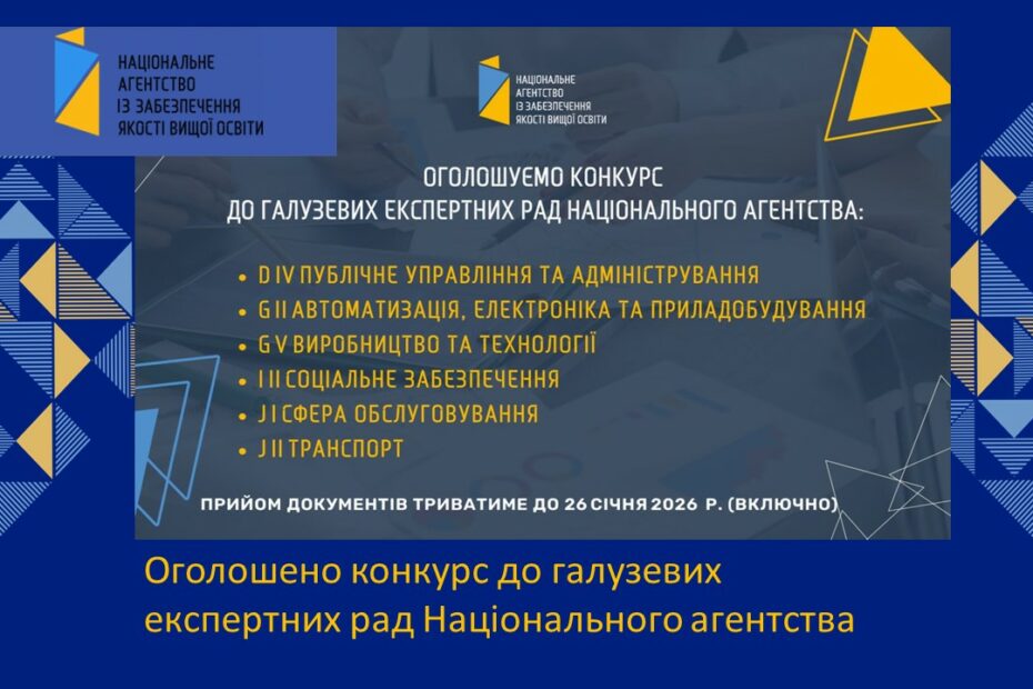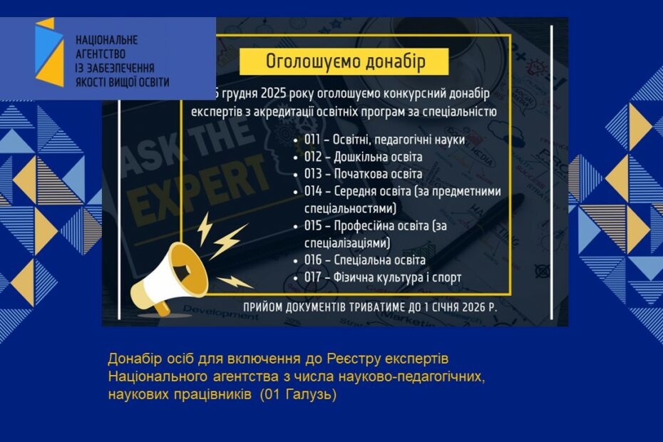 Анонс – Донабір експертів з акредитації освітніх програм з числа науково-педагогічних та наукових працівників (01 Галузь)25.12.202526.12.2025