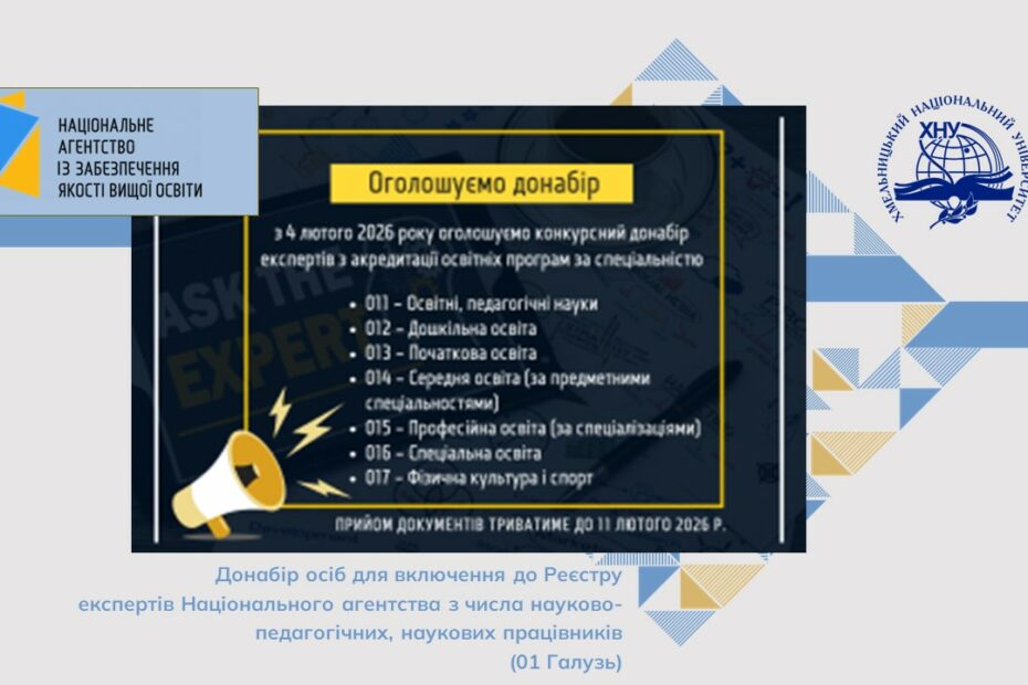 Анонс – Донабір осіб для включення до Реєстру експертів Національного агентства з числа науково-педагогічних, наукових працівників (01 Галузь)05.02.202605.02.2026