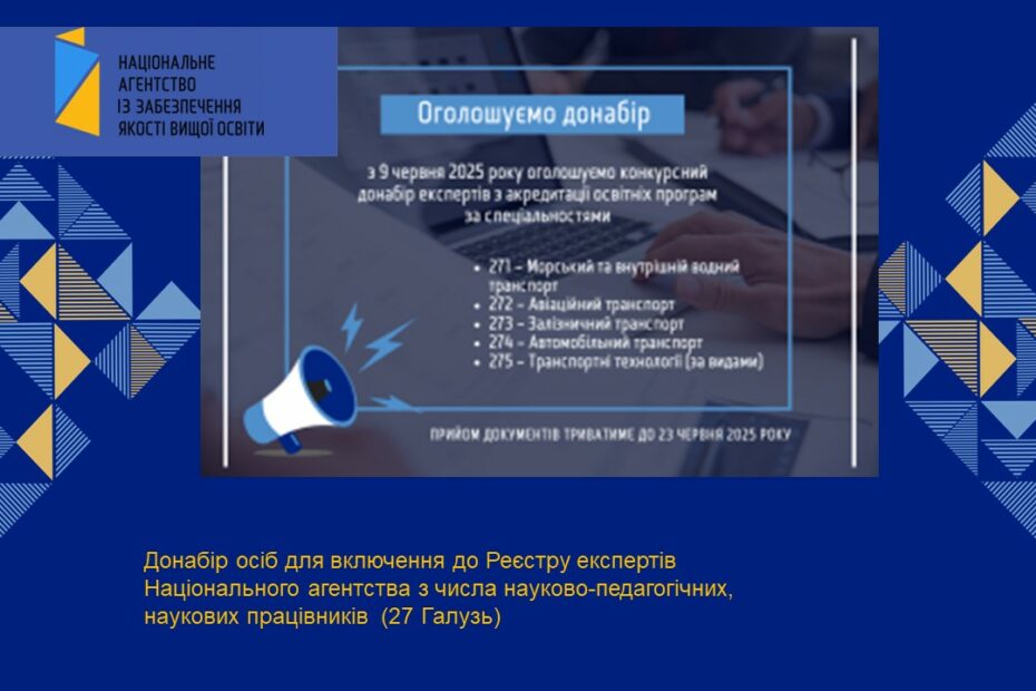 Анонс – Донабір осіб для включення до Реєстру експертів Національного агентства з числа науково-педагогічних, наукових працівників (27 Галузь)09.06.202504.08.2025
