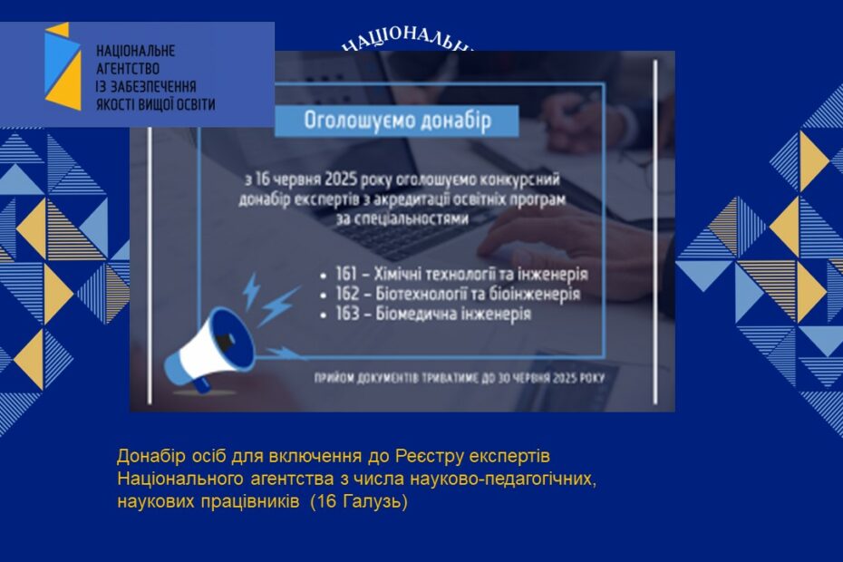 Анонс – Донабір осіб для включення до Реєстру експертів Національного агентства з числа науково-педагогічних, наукових працівників (16 Галузь)17.06.202504.08.2025