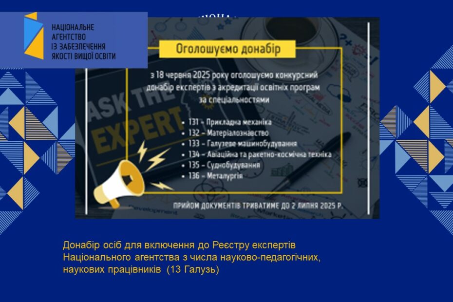 Анонс – Донабір осіб для включення до Реєстру експертів Національного агентства з числа науково-педагогічних, наукових працівників (13 Галузь)18.06.202504.08.2025