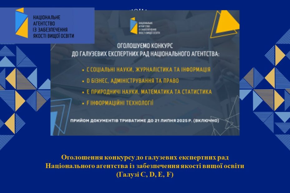 Анонс – Оголошення конкурсу до галузевих експертних рад Національного агентства із забезпечення якості вищої освіти (Галузі C, D, E, F)25.06.202504.08.2025
