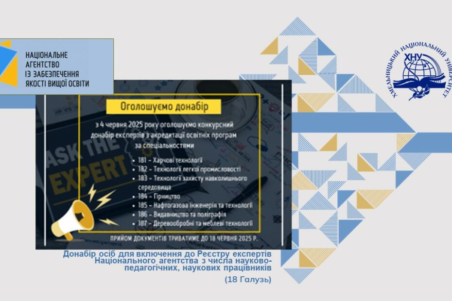 Анонс – Донабір осіб для включення до Реєстру експертів Національного агентства з числа науково-педагогічних, наукових працівників (18 Галузь)04.06.202505.08.2025