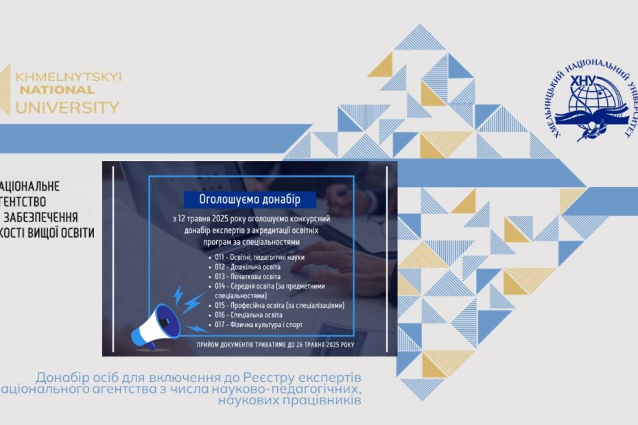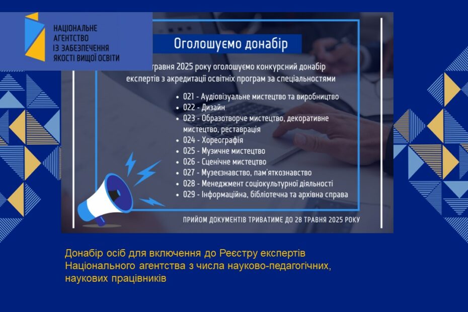 Анонс – НАЗЯВО оголошує донабір експертів з акредитації освітніх програм (01 Галузь)13.05.202505.08.2025