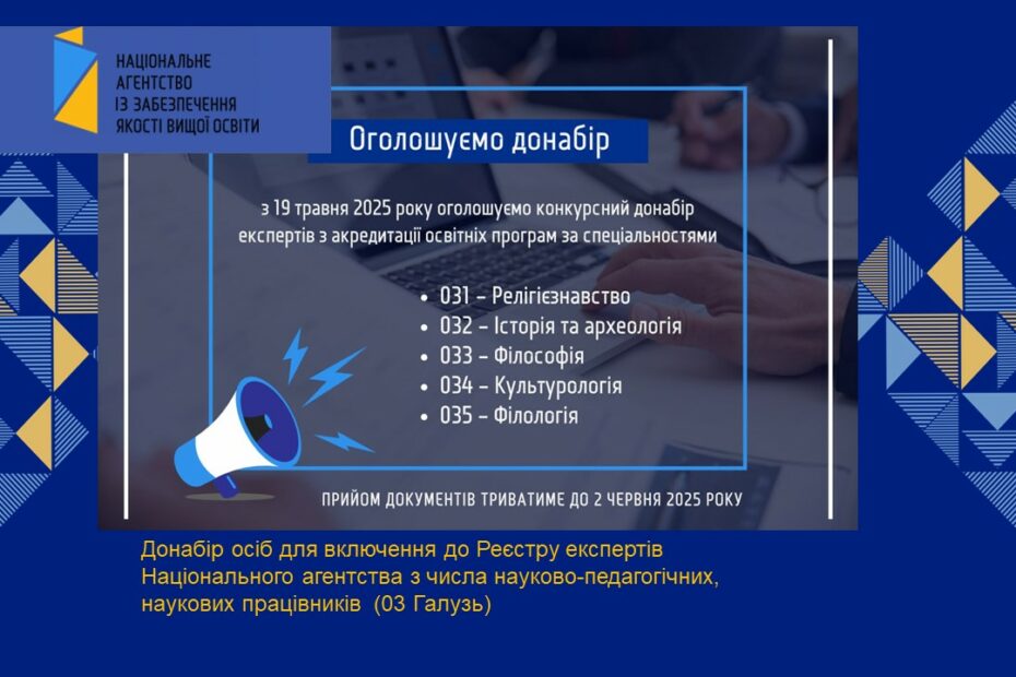 Анонс – НАЗЯВО оголошує донабір експертів з акредитації освітніх програм (03 Галузь)20.05.202505.08.2025