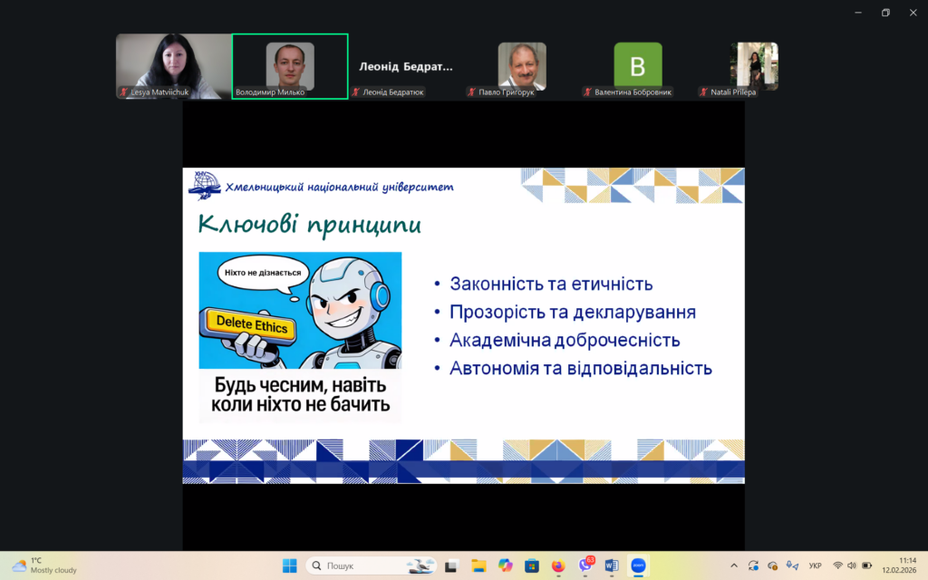 Учасники вебінару ознайомилися з базовими принципами формування політики використання штучного інтелекту у Хмельницькому національному університеті, отримали методичні рекомендації щодо його впровадження в освітній процес, сформували цілісне розуміння принципів і правил етичного, свідомого, безпечного та відповідального використання технологій ШІ в освітньому процесі, у науковій, науково-технічній, мистецькій та інноваційній діяльності Університету, а також у процесі управління закладом.