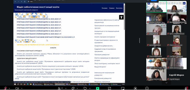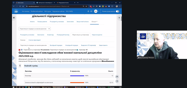 5 січня 2026 року відділ ЗЯВО спільно з відповідальним за технічну підтримку ІС Модульне середовище для навчання Володимиром Мильком провели збори з питань розміщення анонімних анкет опитування здобувачів вищої освіти щодо якості викладання освітніх компонентів (обов’язкових, вибіркових навчальних дисциплін; курсового проєктування; дипломного проєктування; практичної підготовки) та організації такого опитування кафедрами, гарантами освітніх програм.