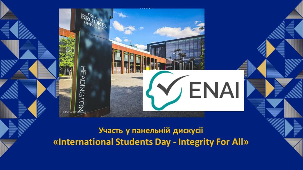 До Міжнародного дня студентів амбасадори академічної доброчесності взяли участь у панельній дискусії «International Students Day – Integrity For All», організованій Oxford Brookes University. У межах заходу обговорювалися питання забезпечення та особливості дотримання академічної доброчесності міжнародними студентами, важливість поваги до національних і культурних відмінностей, а також роль просвітництва й ефективної комунікації у формуванні відповідального академічного середовища (більш детально).