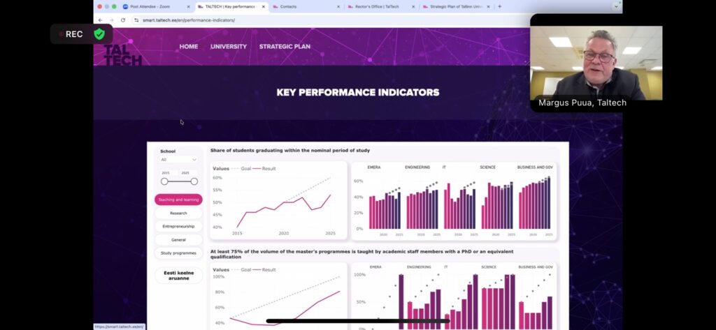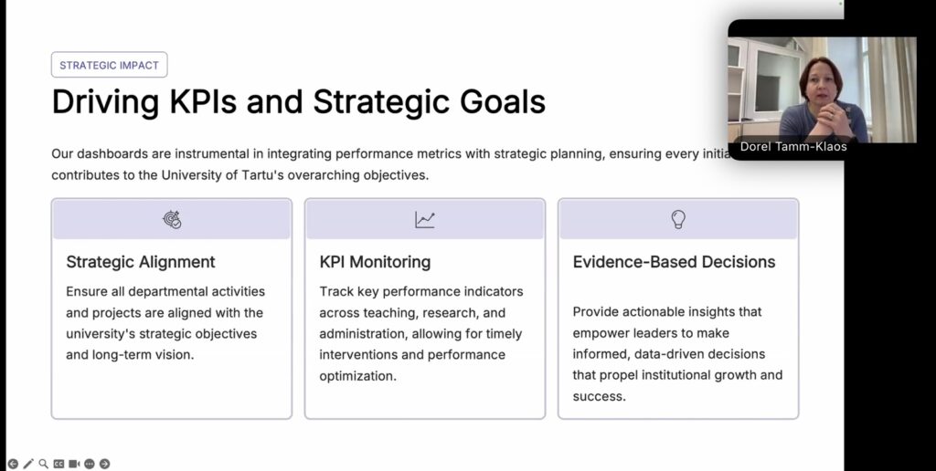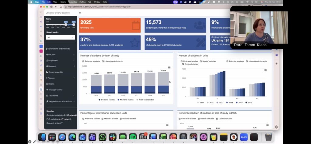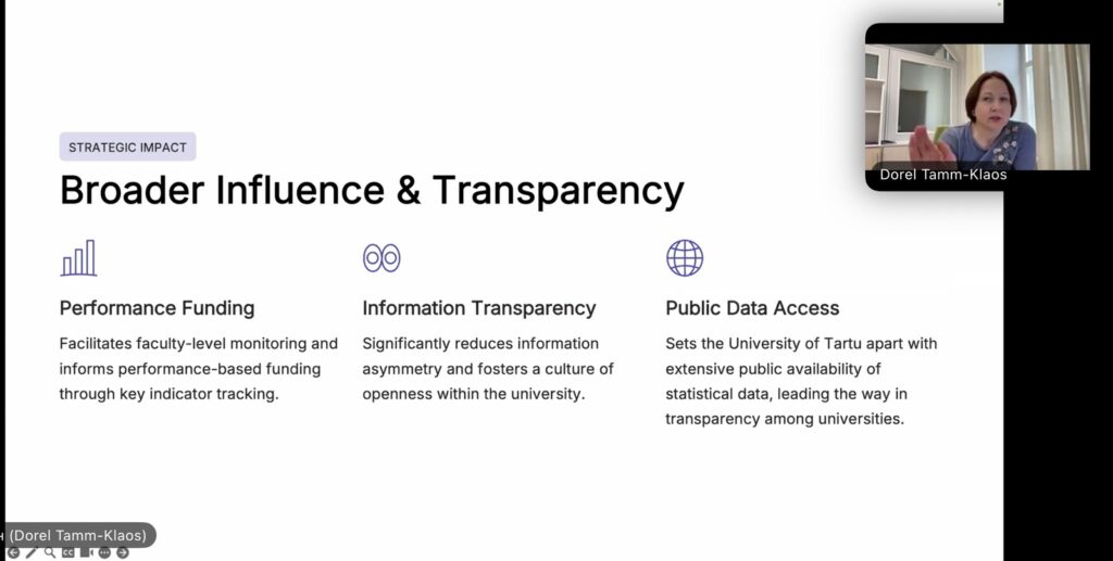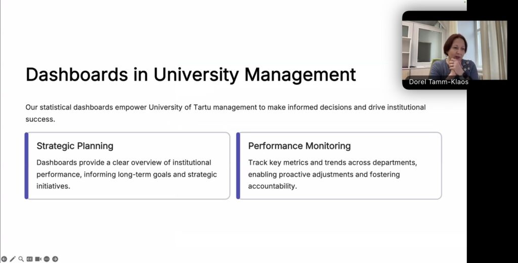 Під час вебінару представники Університету Тарту та Талліннського технічного університету презентували моделі функціонування внутрішніх систем забезпечення якості освіти, акцентувавши увагу на інструментах, що підтримують ефективне управління й менеджмент закладів. Особливий інтерес викликала демонстрація інтерактивних дашбордів, які є відкритими й доступними для всіх зацікавлених сторін — від керівництва до викладачів, студентів і партнерів.