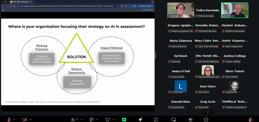 Захід був присвячений перетину академічної доброчесності, благополуччя студентів та використання штучного інтелекту в освітньому процесі. У межах зустрічі було розглянуто ключові ризики, пов’язані з упровадженням інструментів ШІ, зокрема вплив на критичне мислення, академічну доброчесність та когнітивні навички, соціальний та емоційний розвиток, питання рівності й доступу, безпеки даних, академічних стандартів, оцінювання та інституційної довіри.