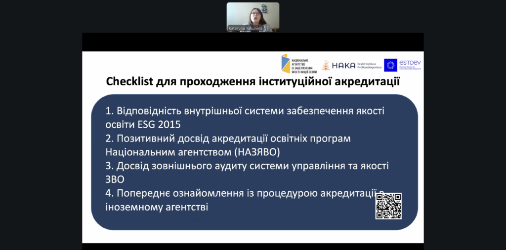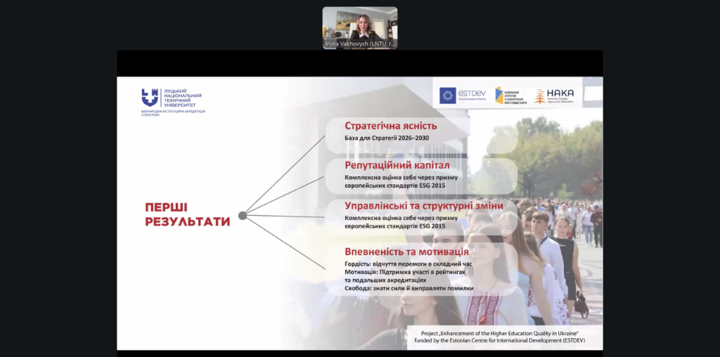 19 лютого 2026 року фахівці відділу відвідали вебінар на тему: «Міжнародна інституційна акредитація українських університетів: перші результати, переваги й виклики», організований у межах спільного проєкту Національного агентства із забезпечення якості вищої освіти та Естонського агентства якості освіти (HAKA) за підтримки ESTDEV.