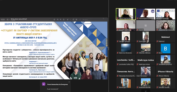 27 листопада 2025 відбулися збори учасників фокус-груп здобувачів вищої освіти із забезпечення якості освітньої діяльності та якості вищої освіти на тему «Студент як партнер у системі забезпечення якості вищої освіти». У зборах взяли участь 180 здобувачів вищої освіти з восьми факультетів та рівнів вищої освіти «бакалавр», «магістр», «доктор філософії».