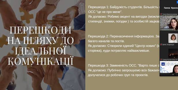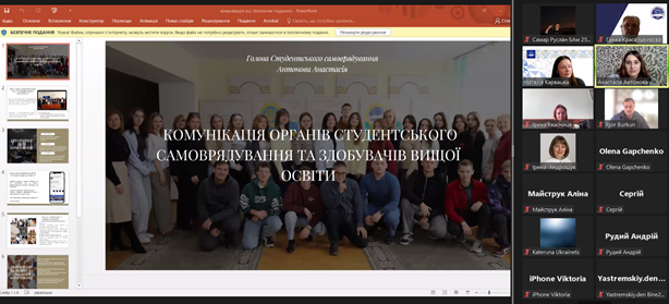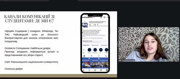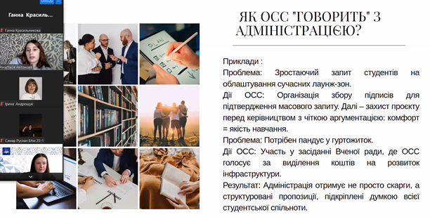 На завершення зустрічі виступила голова Студентської ради університету Анастасія АНТОНОВА і розповіла про роботу органів студентського самоврядування з адміністрацією та канали комунікації зі здобувачами освіти з метою покращення якості освітнього середовища університету та підвищення якості вищої освіти.