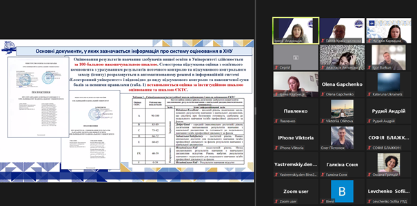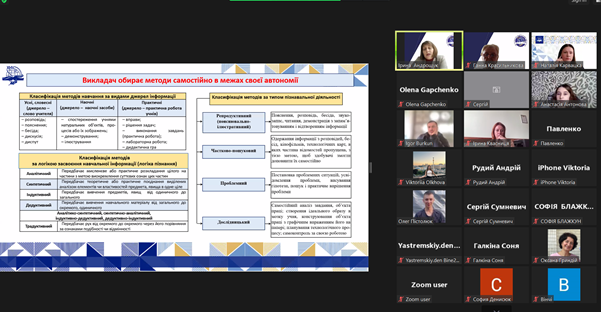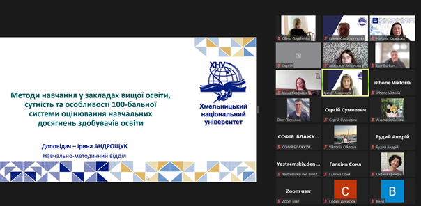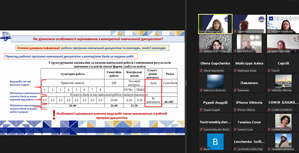 Виступ завідувачки навчально-методичного відділу Ірини Андрощук був присвячений повідомленню про методи навчання в університеті, їх вибір в межах кожної навчальної дисципліни в залежності від специфіки змісту навчального матеріалу. Ірина Василівна охарактеризувала 100-бальну систему оцінювання результатів навчання, що запроваджена в освітній процес університету з 01.09.2025 року, продемонструвала основні документи, в яких можна знайти інформацію про систему оцінювання, навела приклади структурування навчальної дисципліни за видами робіт та розподіл балів між ними.