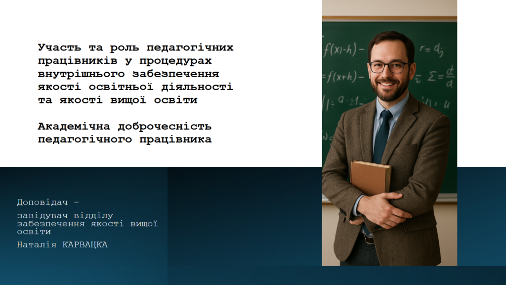 26 грудня 2025 р. завідувач відділу ЗЯВО Наталія Карвацка провела лекцію для педагогічних працівників університету на тему “Участь та роль педагогічних працівників у процедурах внутрішнього забезпечення якості освітньої діяльності та якості вищої освіти. Академічна доброчесність педагогічного працівника” у рамках підвищення кваліфікації за програмою “Розвиток професійних компетентностей педагогічних працівників у сучасному освітньому середовищі ЗВО”, організованих Центром післядипломної освіти.